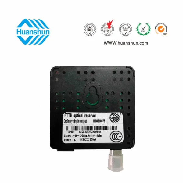 環順的HSGS10076光接收機是專為CATV網絡的FTTH 應用而設計的入戶型光接收機。具有結構小巧緊湊、式樣美觀、 應用方便等 特點,在高達1000Mhz的帶寬下能夠提供穩定的輸出電平和優異的性能指標,具有極寬的光功率工作范圍。