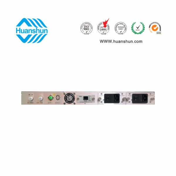 直調(diào)制光發(fā)射機 | HS 15107D | RF80 ± 5 dBuv 輸入,ITU 1550nm, ≥ 7、10 dBm 輸出;1U標準機箱,雙模塊熱插撥電源,AC90 ~ 255V或DC-48V供電,RJ45標準網(wǎng)管(支持SNMP、WEB) |